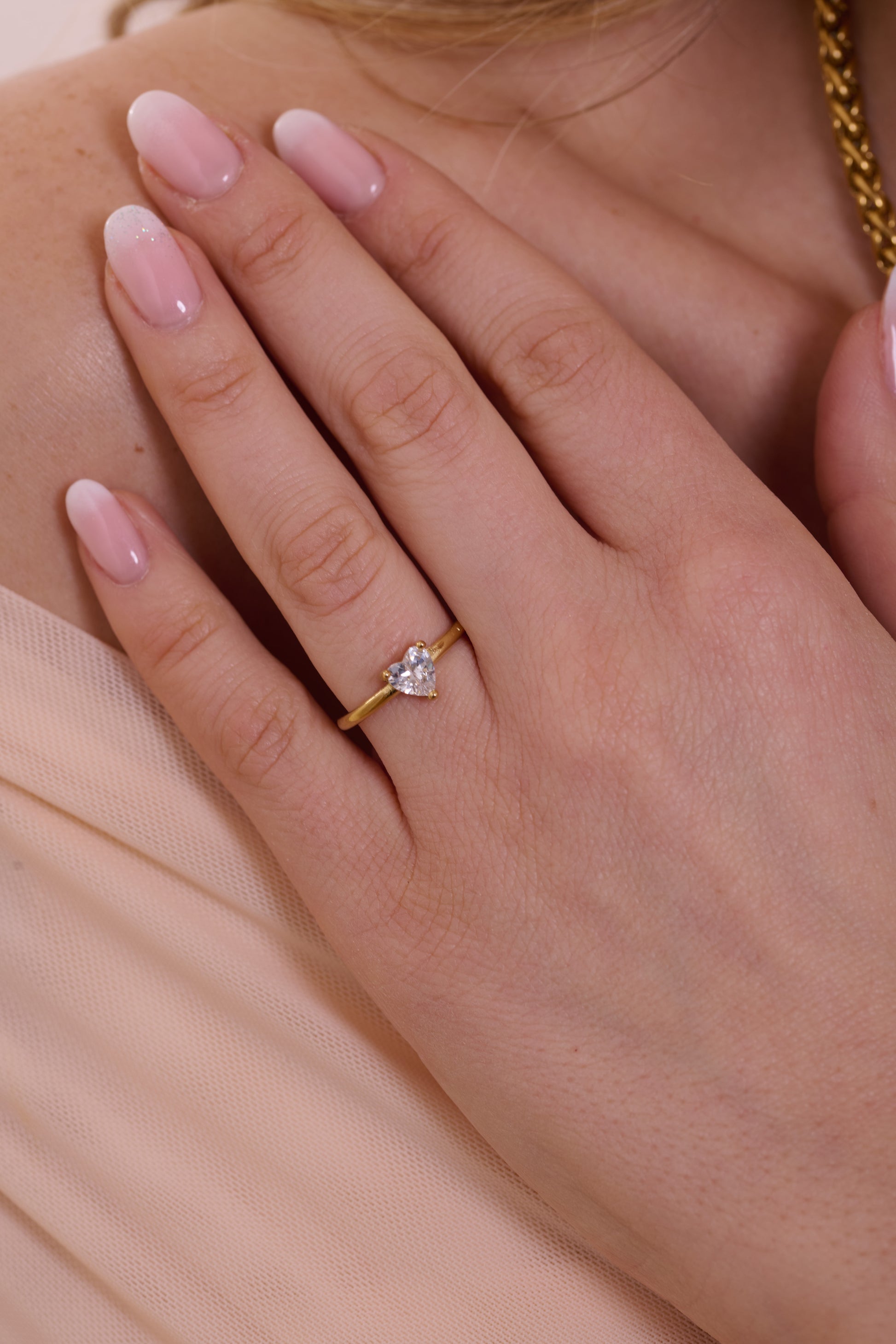 Un delicato anello in acciaio inossidabile con un piccolo cuore solitario, perfetto per aggiungere un tocco di dolcezza al tuo look.