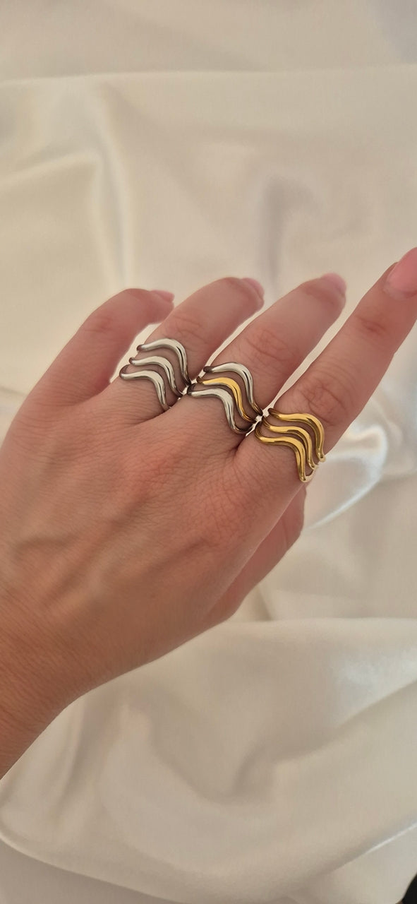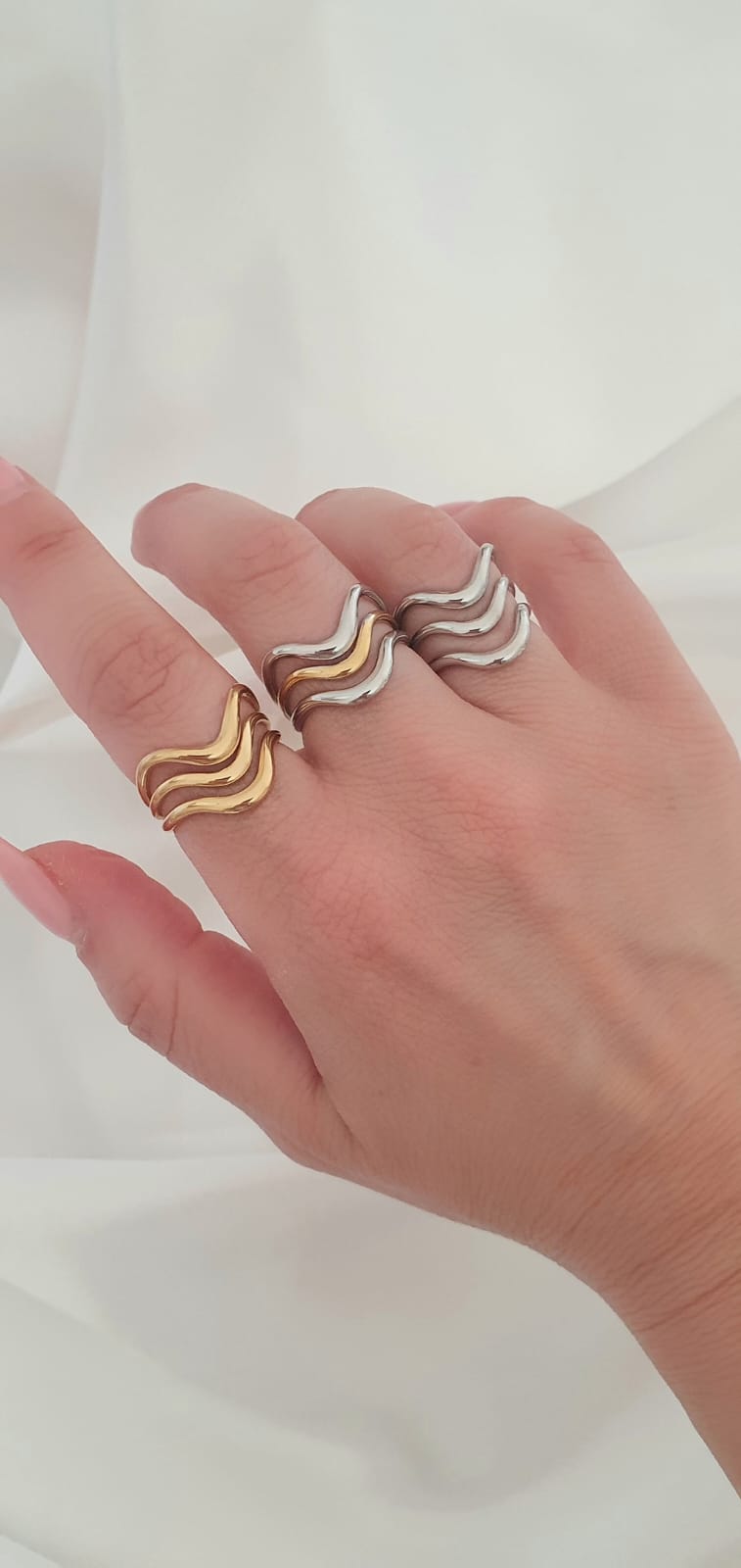 Questo anello in acciaio inossidabile presenta un design moderno e fluido, caratterizzato da tre bande ondulate che si susseguono in modo armonioso. Le linee sinuose creano un effetto di movimento e profondità, avvolgendo il dito con eleganza.