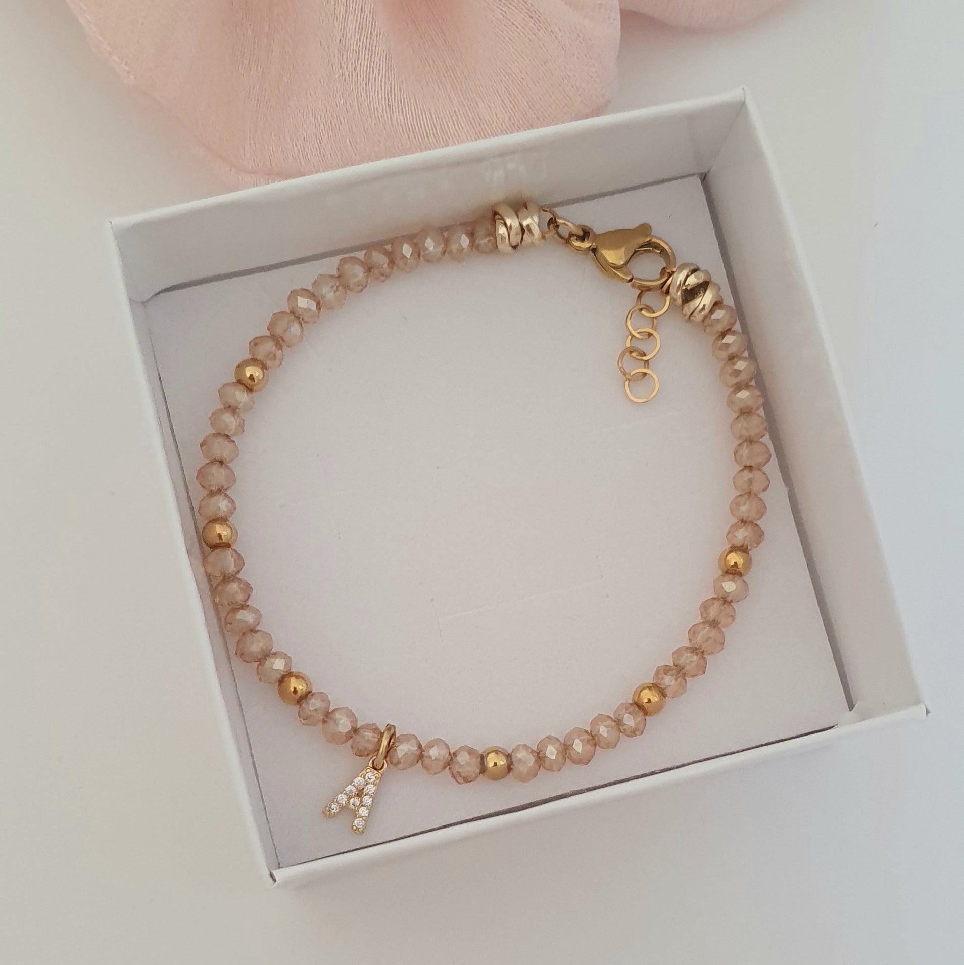 Bracciale delicato con cristallini color champagne, intervallati da piccole perline in acciaio inossidabile dorato.