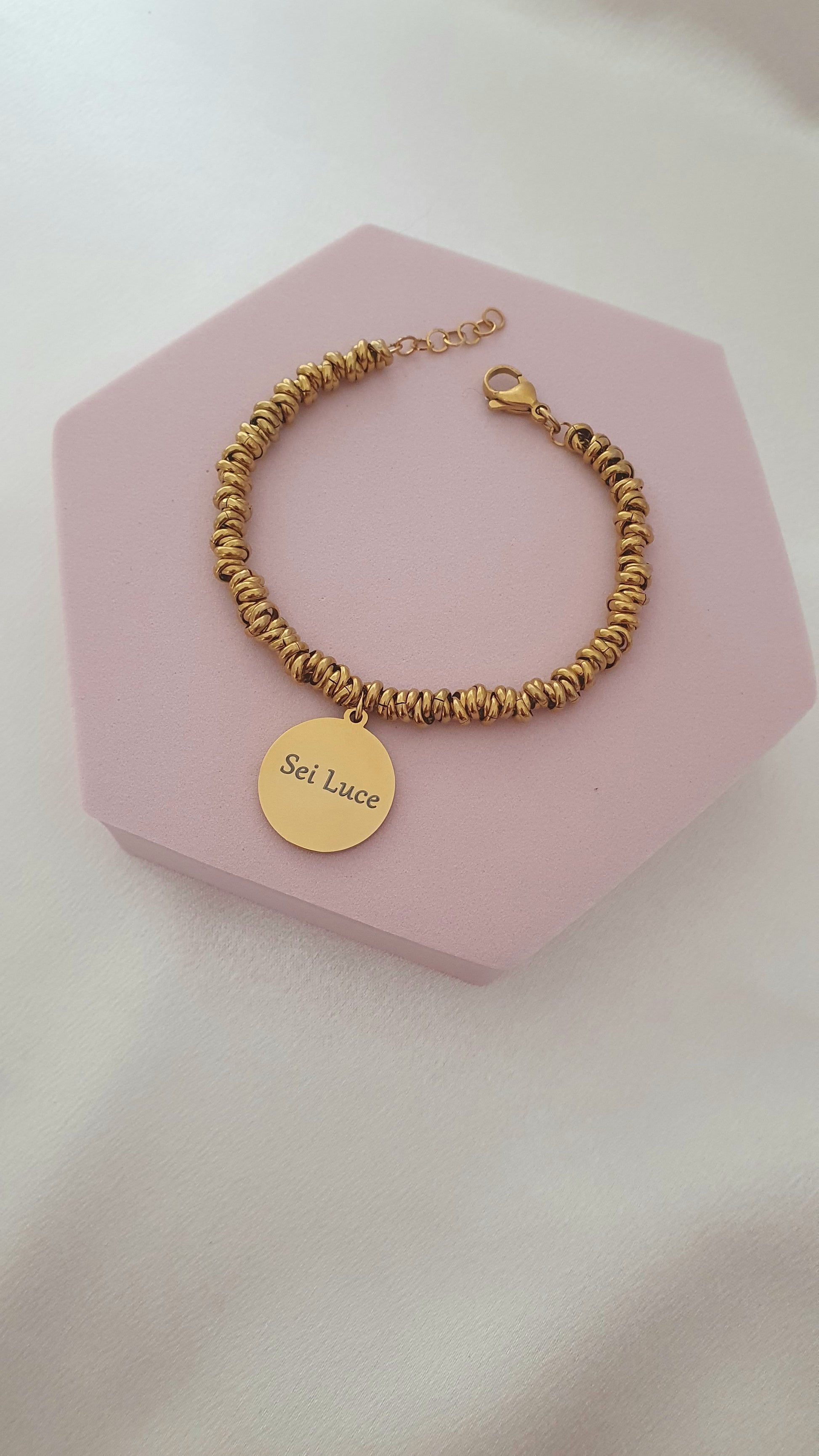 Bracciale realizzato in acciaio inossidabile gold, il ciondolo dal diametro 2 cm è in acciaio inossidabile.