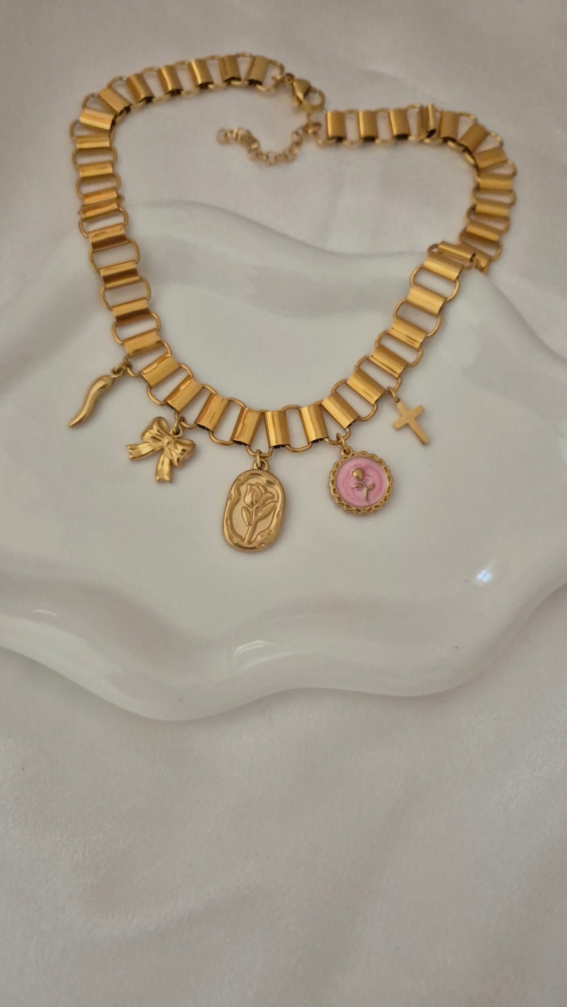 * Al centro, un ciondolo ovale con una rosa in rilievo.