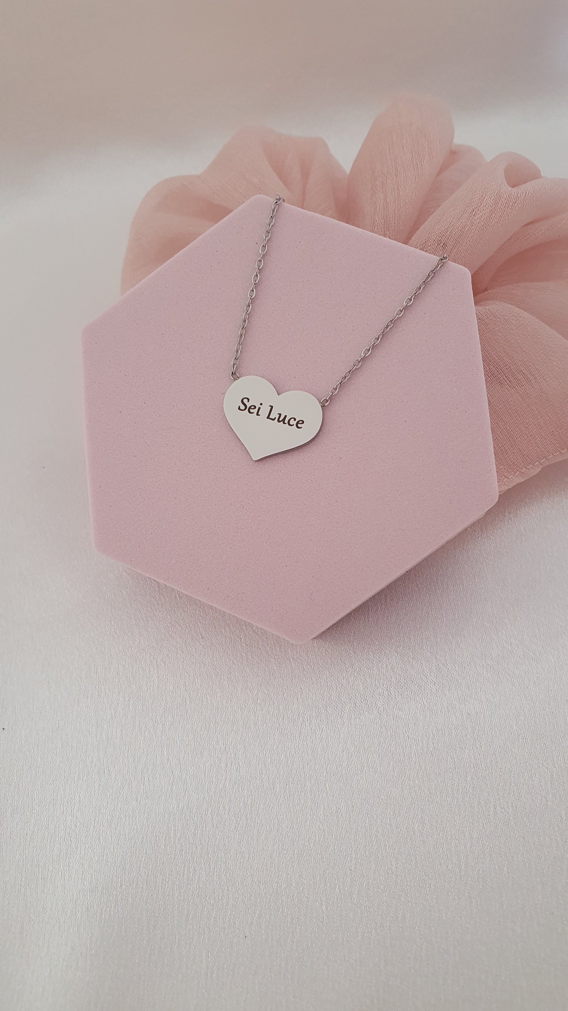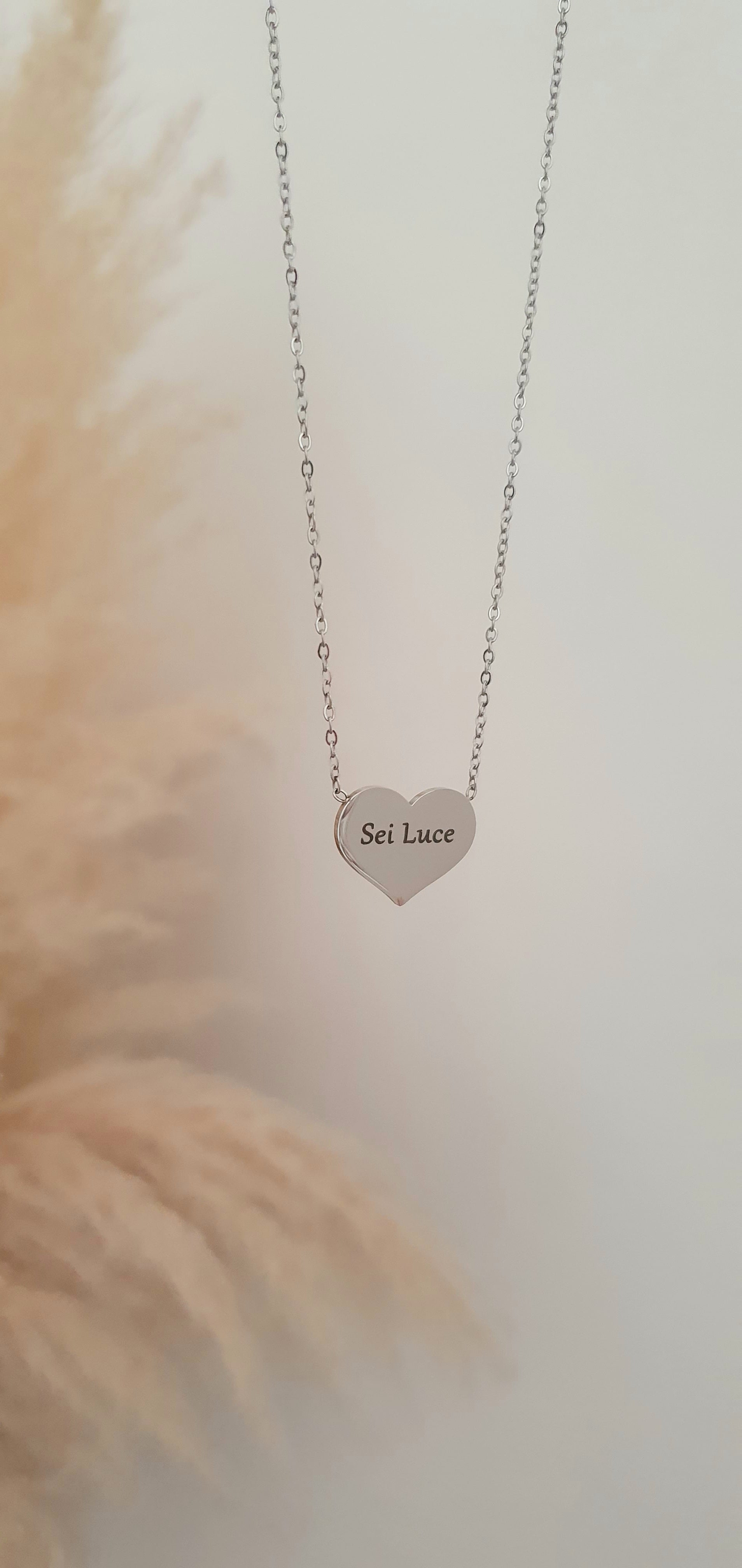 La collana è realizzata in acciaio inossidabile, al centro presenta un cuore su cui si possono incidere massimo tre parole : un nome, una data o una piccola dedica.