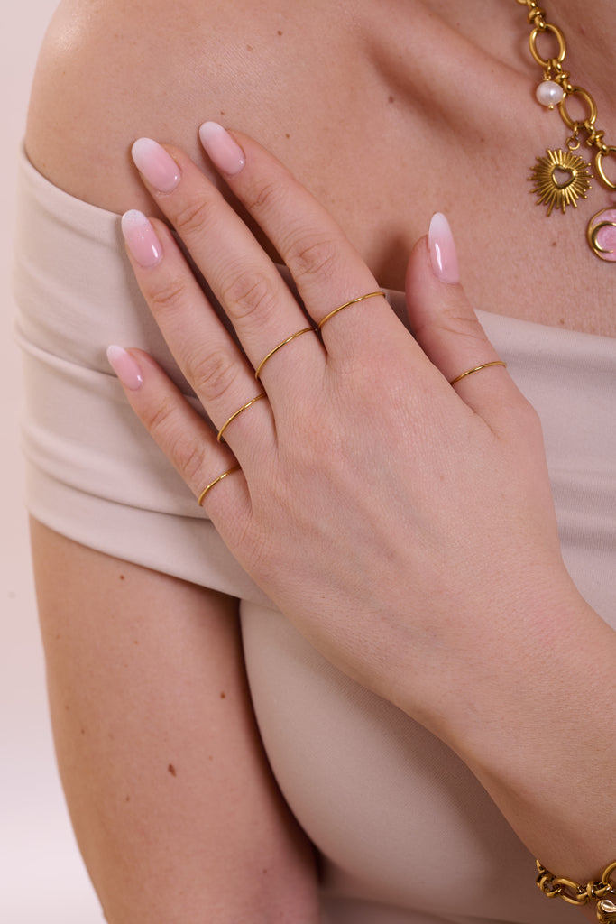 Questo set include cinque anelli sottili, realizzati in acciaio inossidabile dorato con misura regolabile. Perfetti da indossare insieme o separatamente, per creare look sempre diversi.